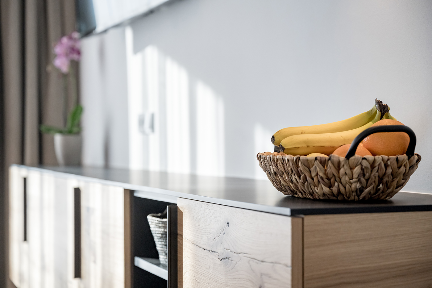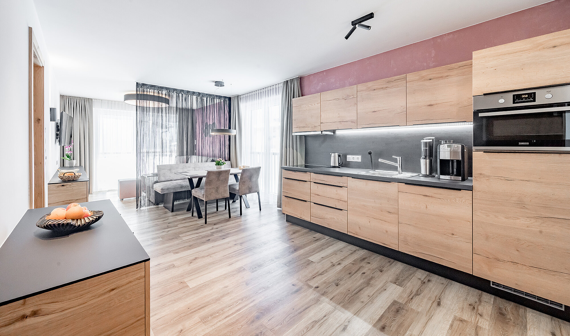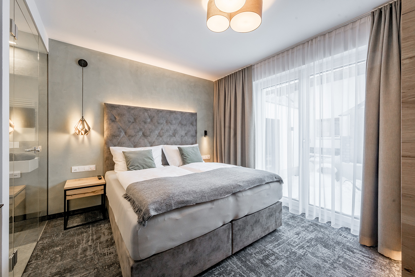 In jedem Apartment empfangen dich Räume mit klarer Linienführung. Mit Ästhetik, die Modernität mit alpiner Wärme verbindet. In der Küche findest du einen SodaStream um das Bergwasser zum Sprudeln zu bringen, eine Nespresso-Maschine für den perfekten Espresso, Toaster, Eierkocher und vieles mehr. Das Badezimmer wird mit begehbarer Dusche mit Infrarotfunktion (Lodge 1, 2 und 3) und extra flauschigen Handtüchern zum Wohlfühlort. Im Schlafzimmer dimmt sich die indirekte Beleuchtung, während du dich in Boxspringbetten sinken lässt – den Härtegrad kannst du individuell einstellen. Die Matratzen sind so bequem, dass du morgens am liebsten nochmal Snooze drücken möchtest. Wenn da nur nicht die 250 Dreitausender wären, hunderte Bike-Kilometer, unzählige Wanderpfade und sechs Skigebiete, die du mit nur einem Skipass erobern kannst...