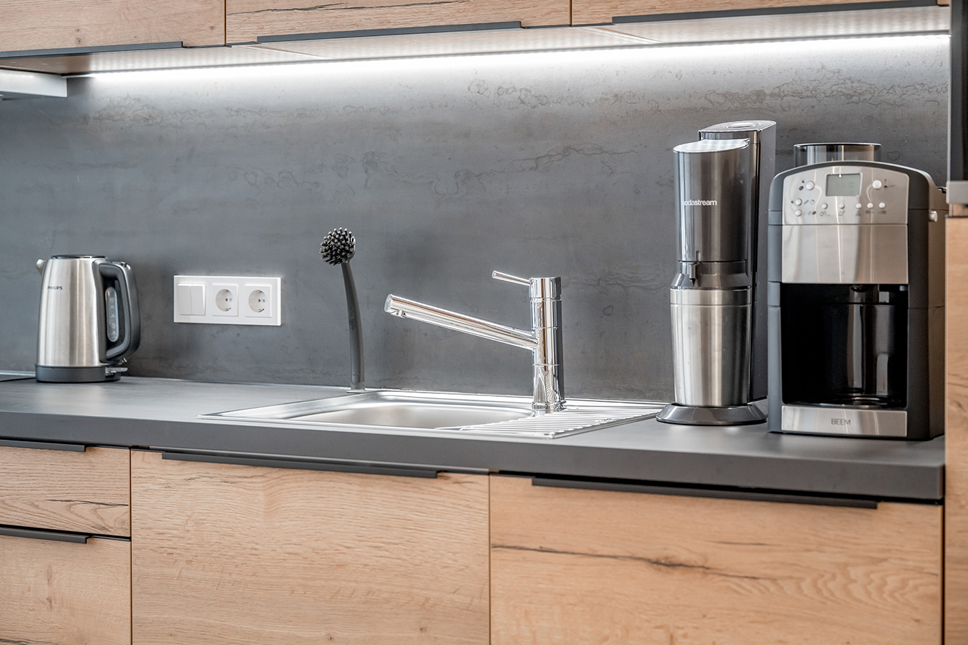 - Vollausgestattete Küchenzeile (Kühlschrank, Gefrierschrank, Spülmaschine, Backofen, Mikrowelle, Kaffeemaschine, SodaStream, Wasserkocher, Toaster, Eierkocher)